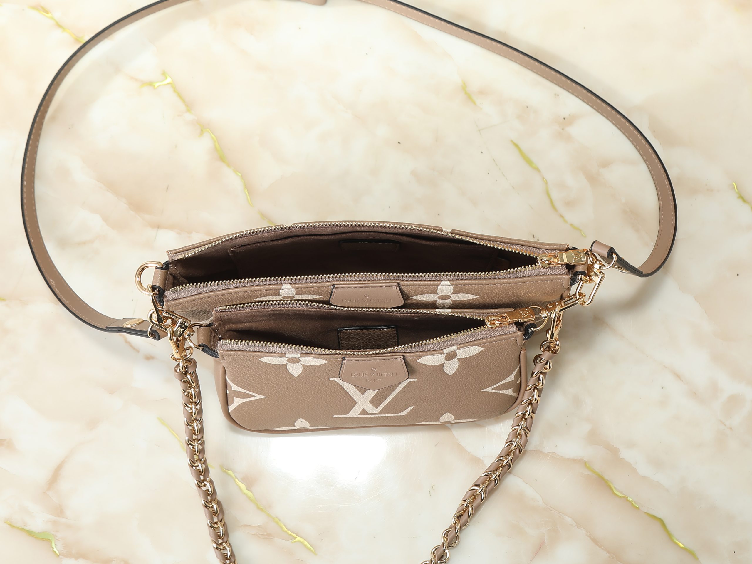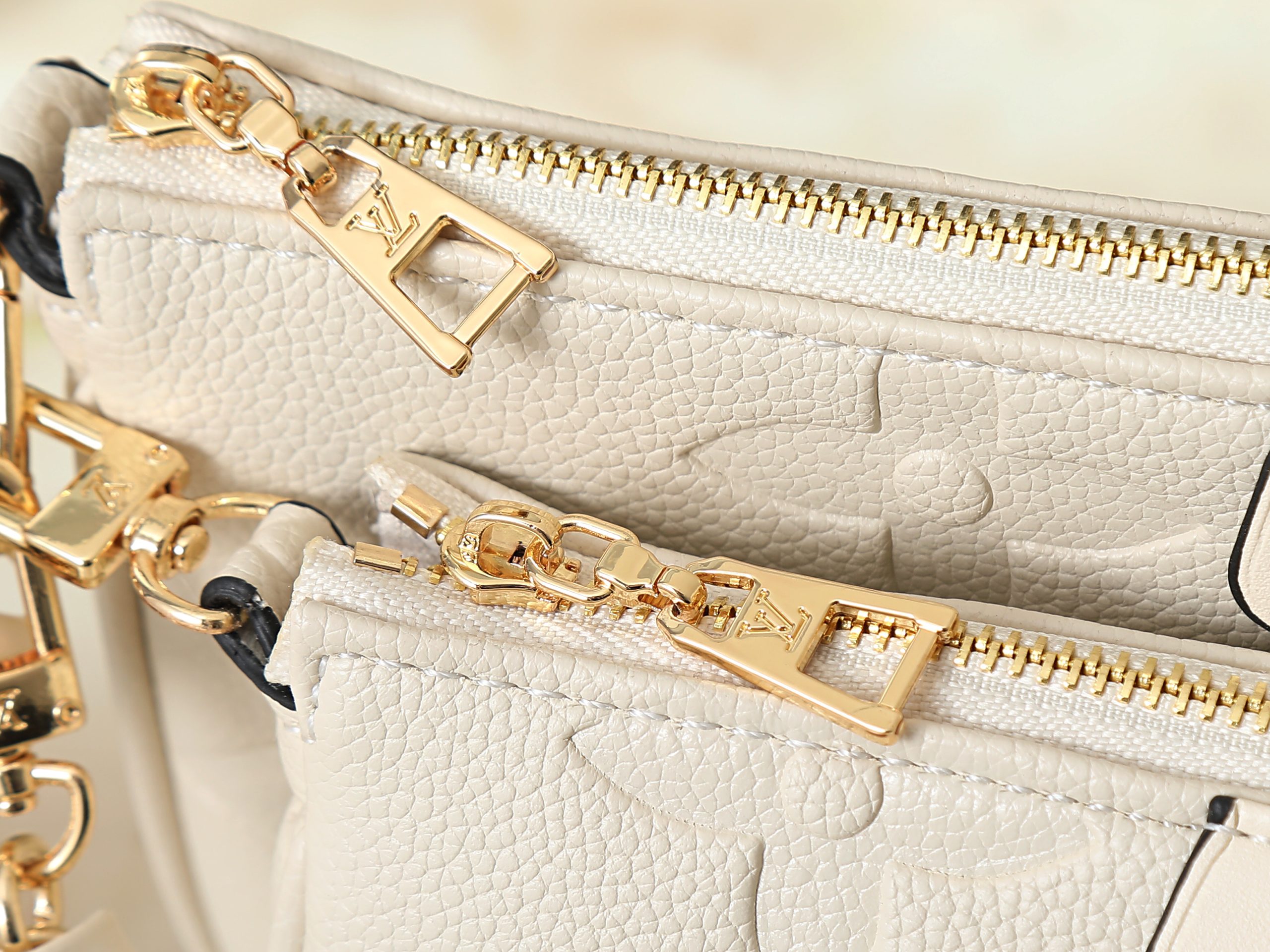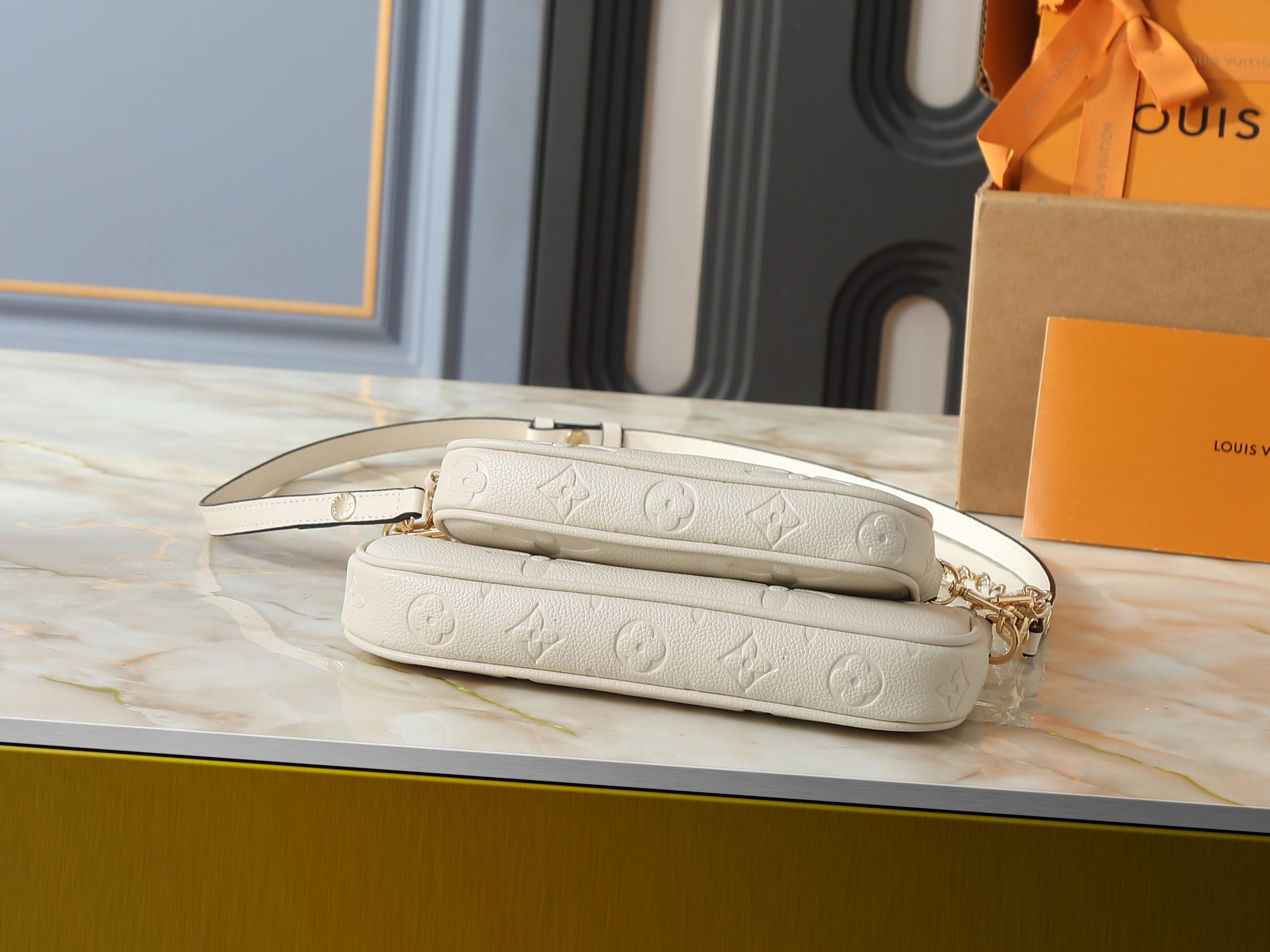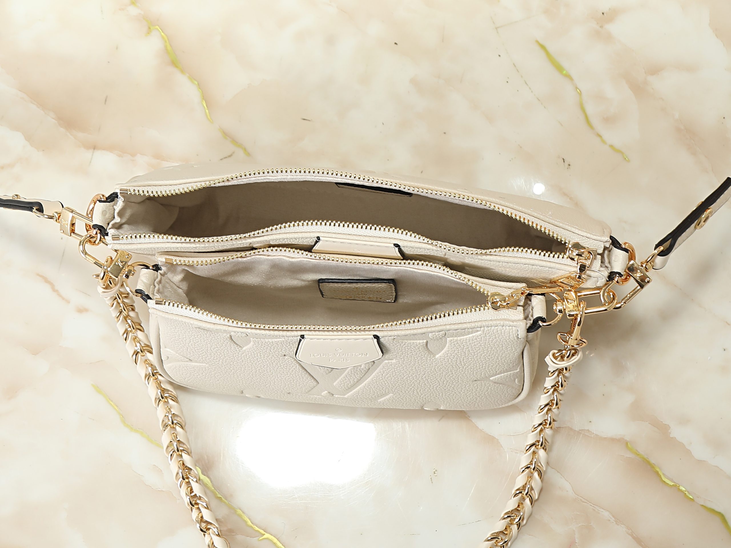 Crafted in embossed monogram leather or bold seasonal monogram finishes, this compact handbag offers a modern interpretation of a house icon. The softly structured silhouette is elevated by polished gold-tone hardware, refined chain accents, and layered pouch styling that adds both visual depth and practical versatility.