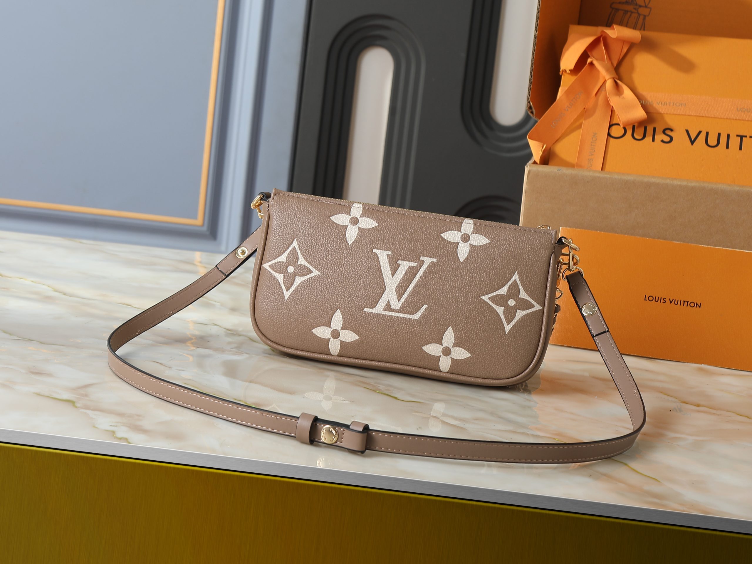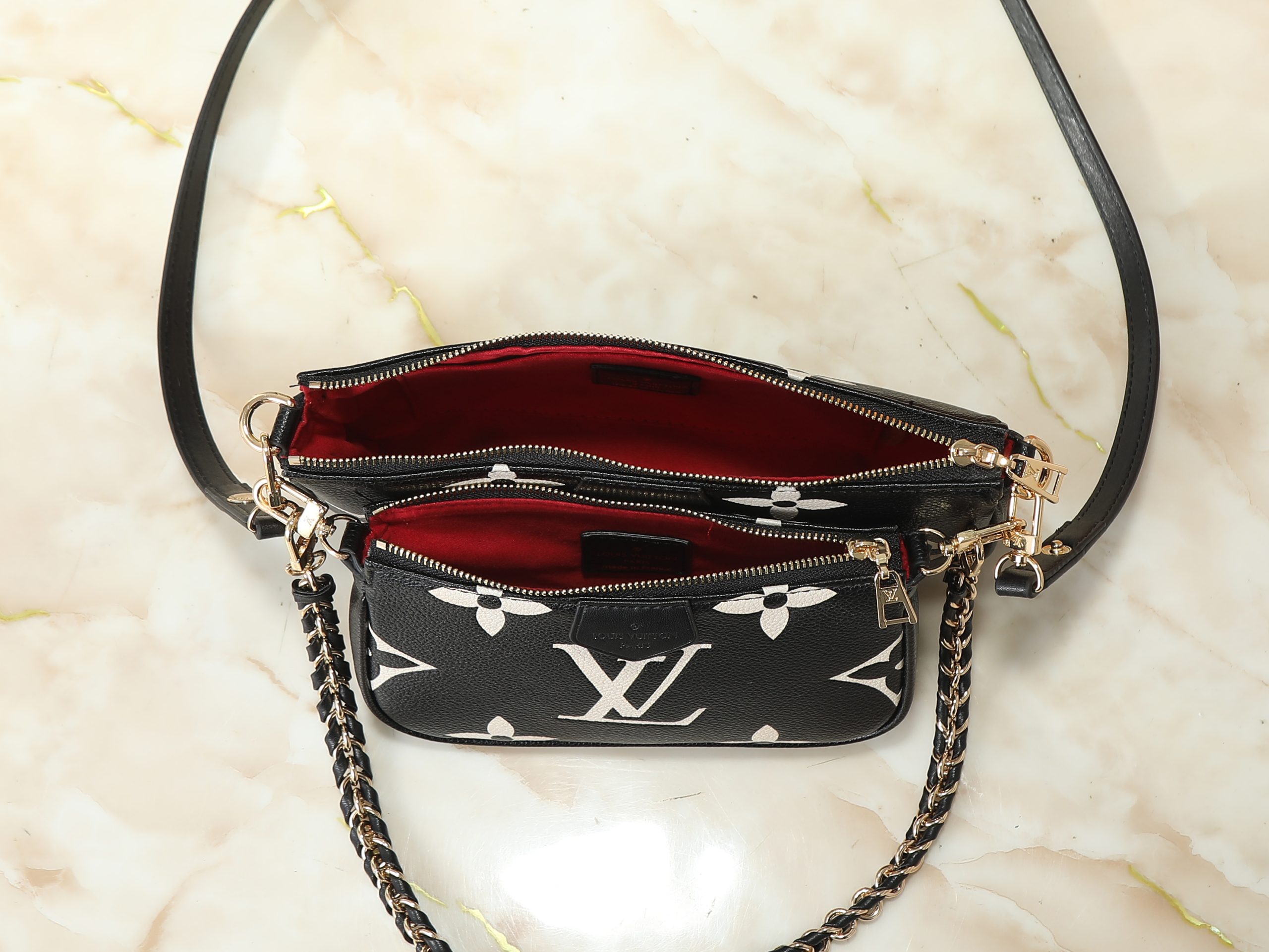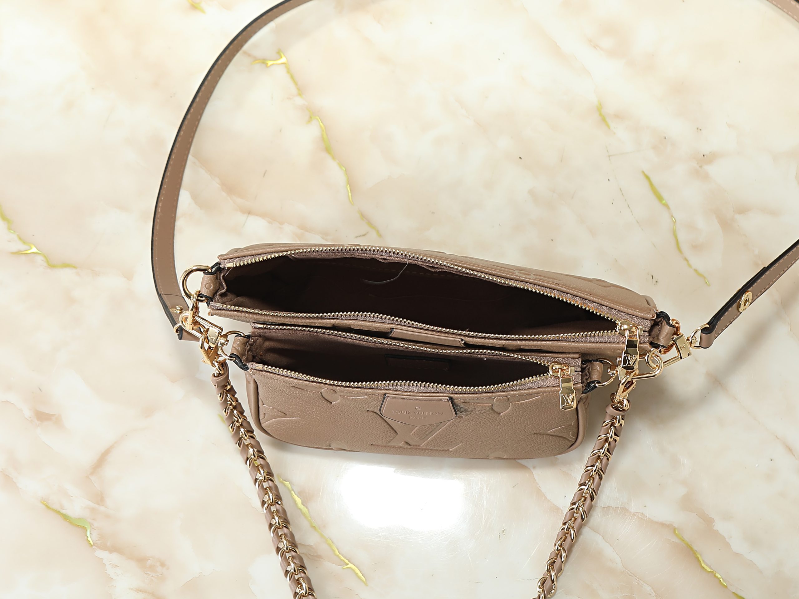 Crafted in embossed monogram leather or bold seasonal monogram finishes, this compact handbag offers a modern interpretation of a house icon. The softly structured silhouette is elevated by polished gold-tone hardware, refined chain accents, and layered pouch styling that adds both visual depth and practical versatility.