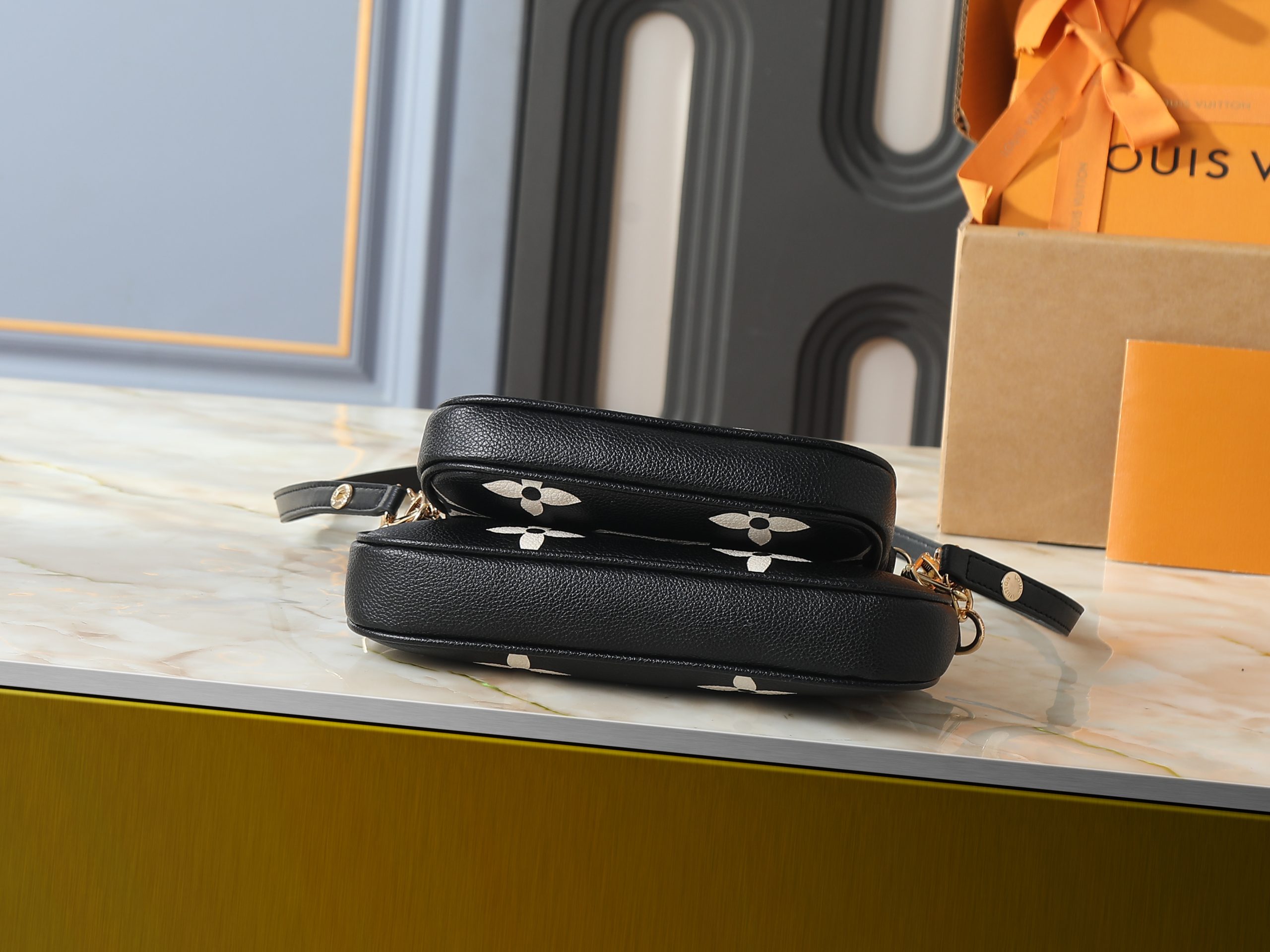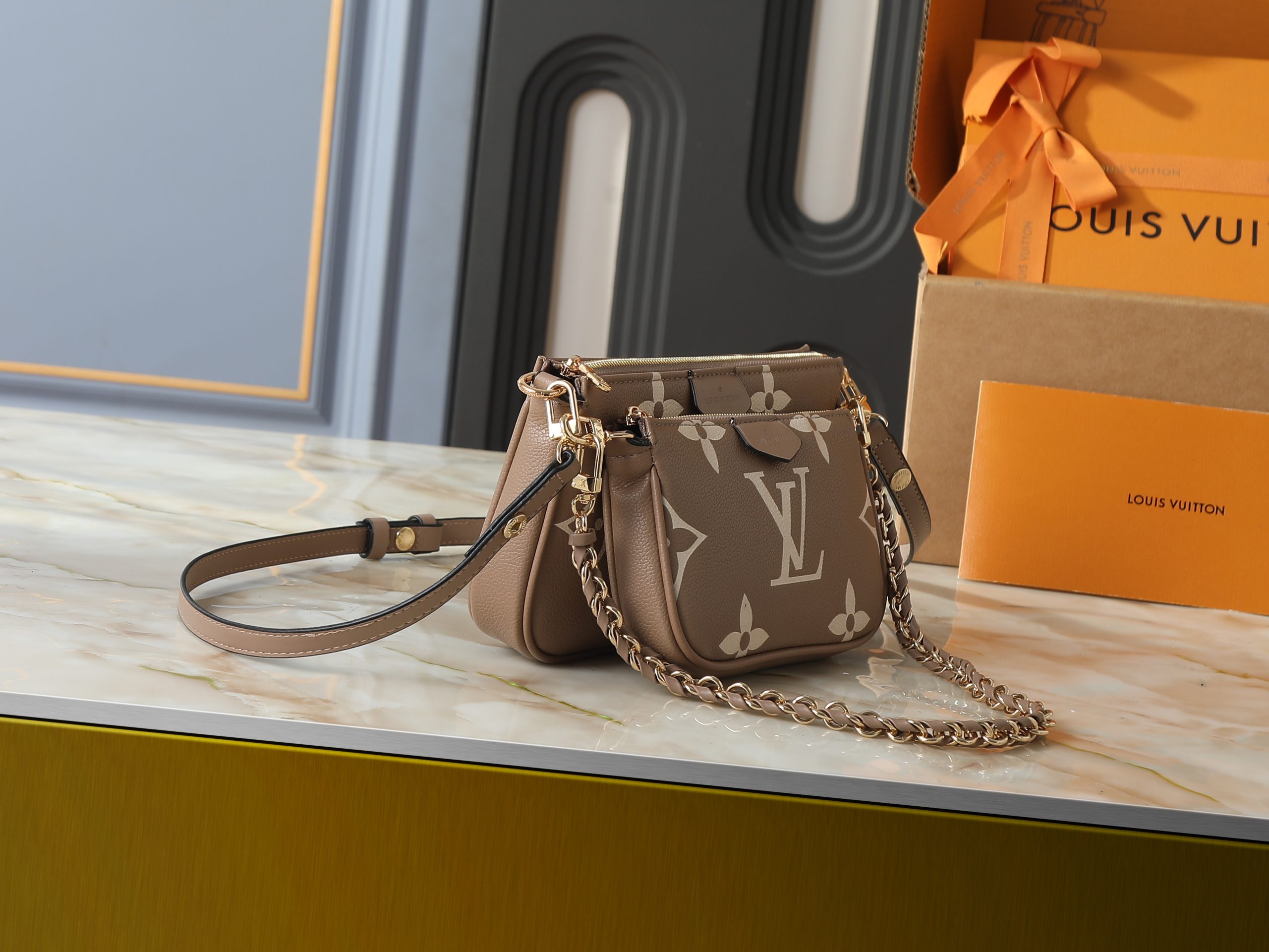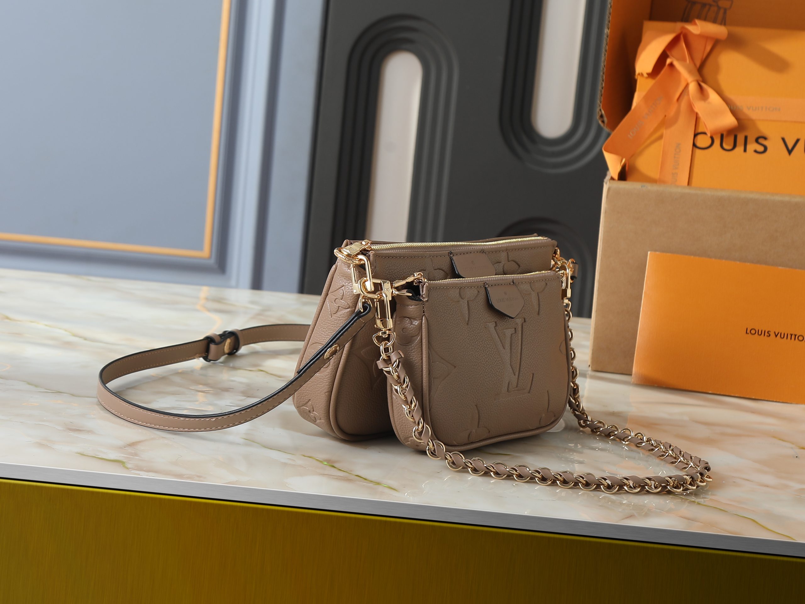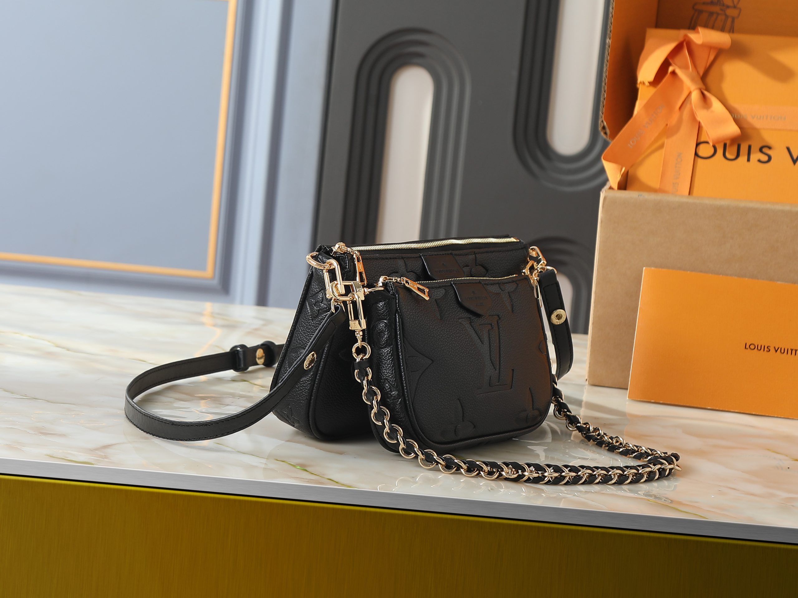 Crafted in embossed monogram leather or bold seasonal monogram finishes, this compact handbag offers a modern interpretation of a house icon. The softly structured silhouette is elevated by polished gold-tone hardware, refined chain accents, and layered pouch styling that adds both visual depth and practical versatility.