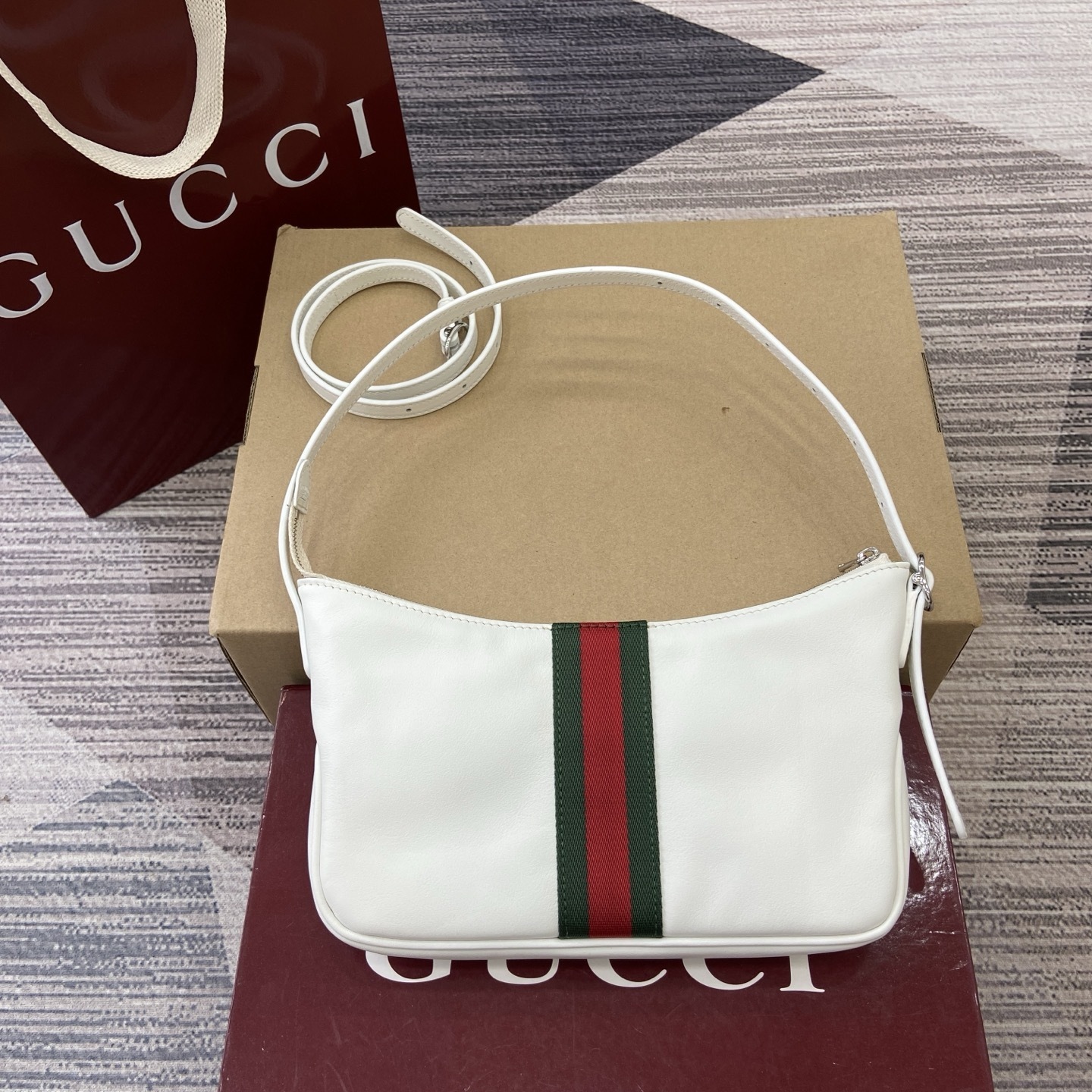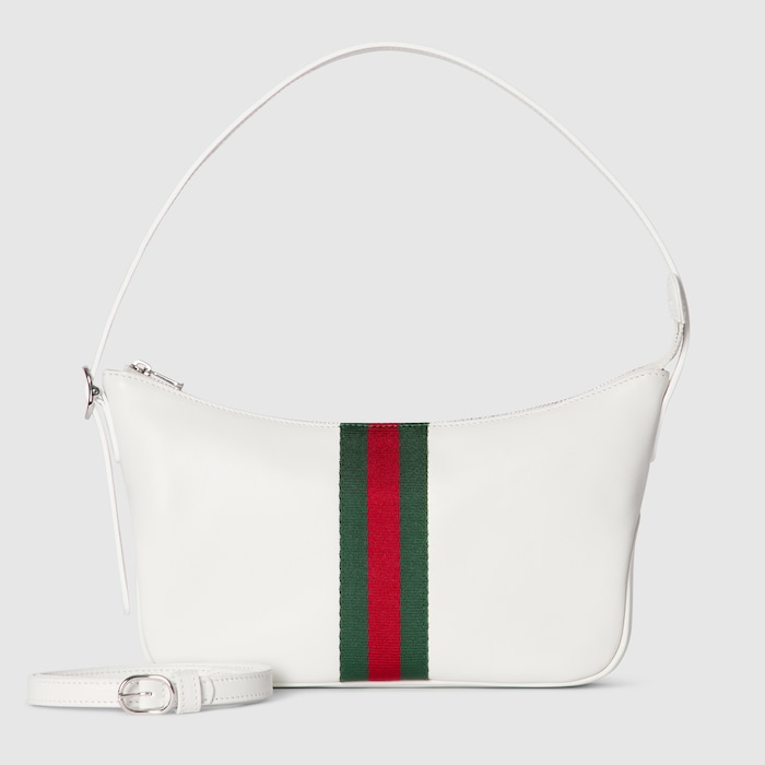 Designed with a sleek, compact shape, this bag features a smooth cream white leather finish that feels fresh, modern, and easy to style. The signature green-red web stripe adds a bold yet classic accent, instantly elevating the minimalist design with a recognizable heritage touch.
